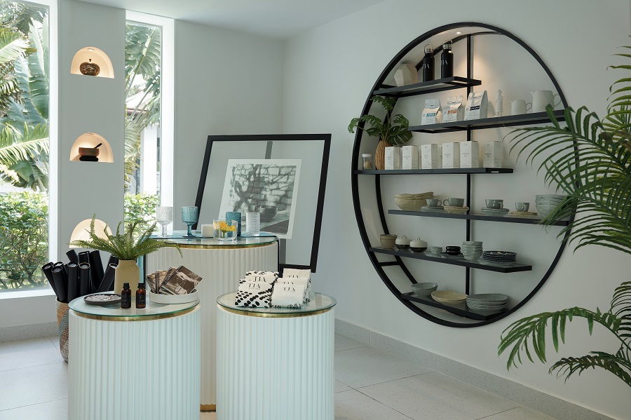 The new lifestyle boutique is now 25% bigger than the previous space and features a simple, calming design with crisp white walls and cool tiled floors, glass panels overlooking lush tropical gardens, and archways–a signature design element of the property.