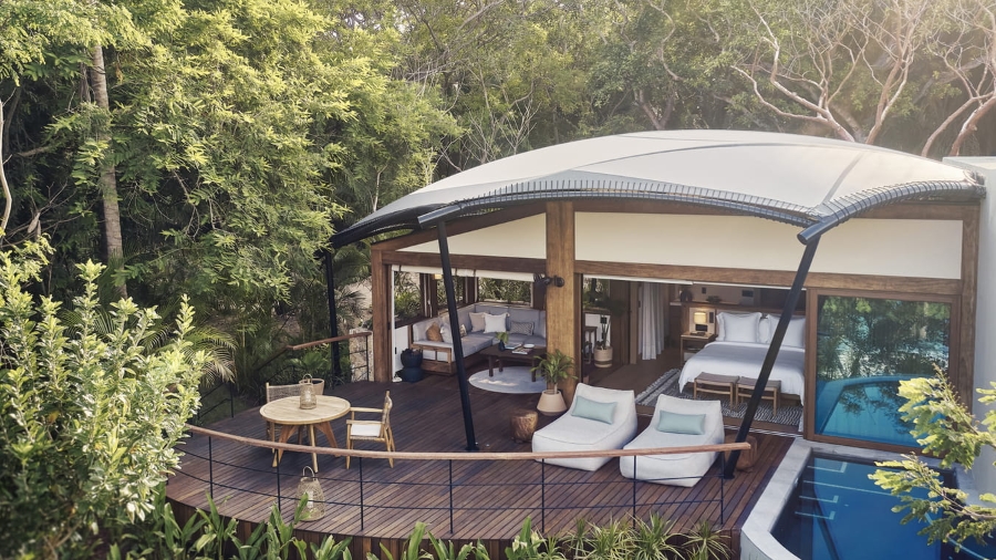 Naviva, A Four Seasons Resort, redefines all-inclusive luxury with a stay as fluid and dynamic as its guests. Set within 48 acres of lush jungle in Punta Mita, Mexico, the resort features 15 luxury tented bungalows designed exclusively for adults, offering an intimate setting for romantic escapes or rejuvenating wellness retreats.